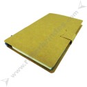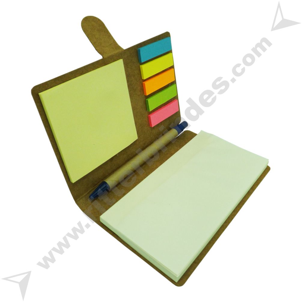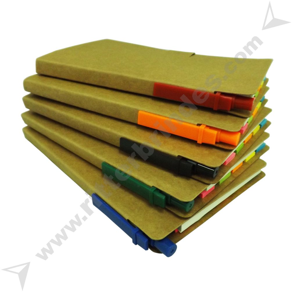 Bloco de anotação com post-its coloridos e caneta, material reciclado.