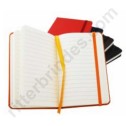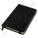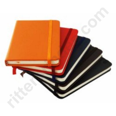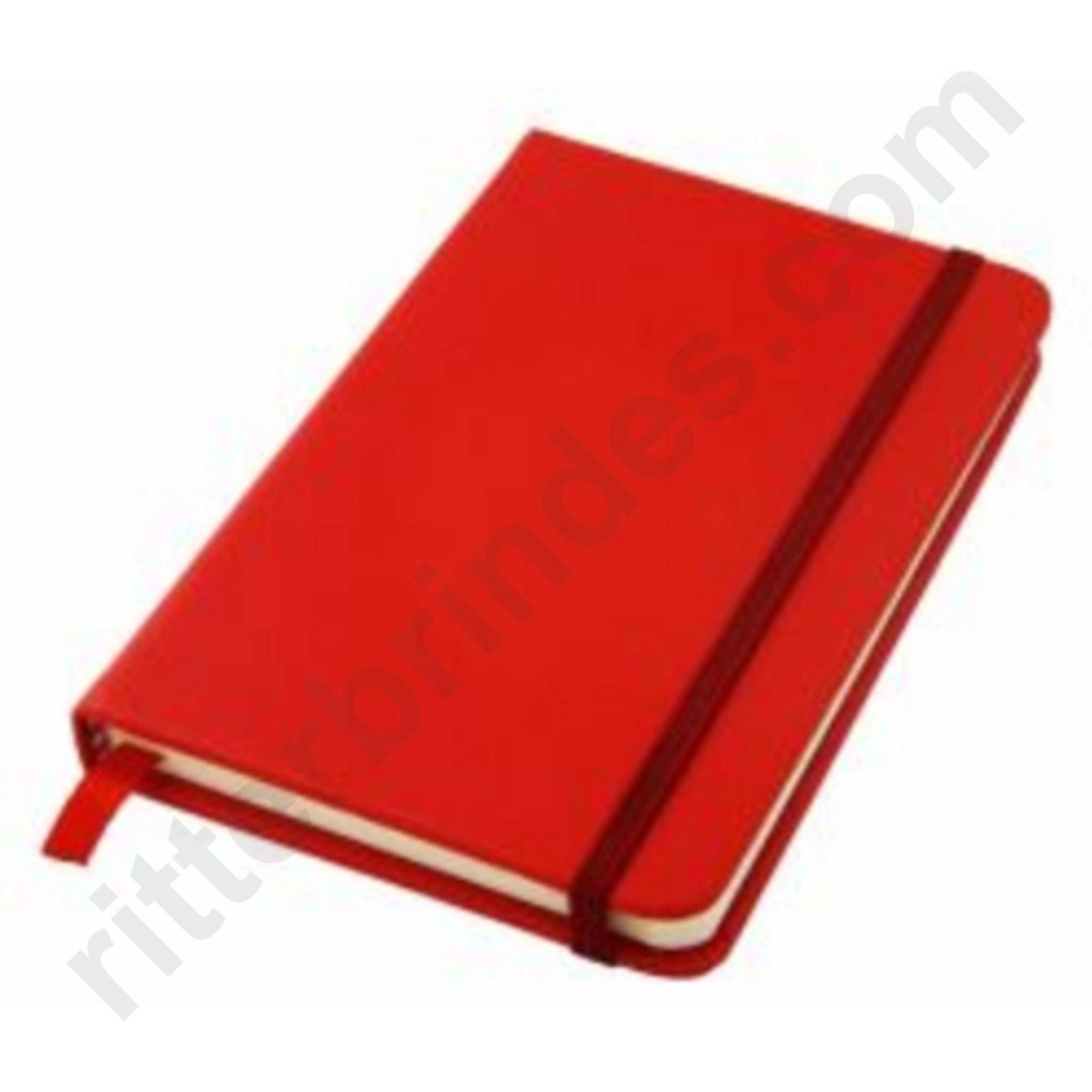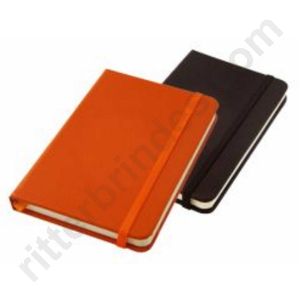 Caderneta tipo Moleskine, com 80 folhas (na cor creme – amarelo claro), folhas pautadas. Material: Couro sintético liso.