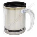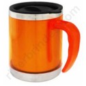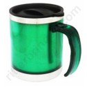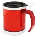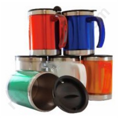 | Caneca de 400 ml, em aço inoxidável com acabamento externo em plástica e base em aço inoxidável polido.Tampa de plástico com fecho rotacional, fundo anti derrapante.
