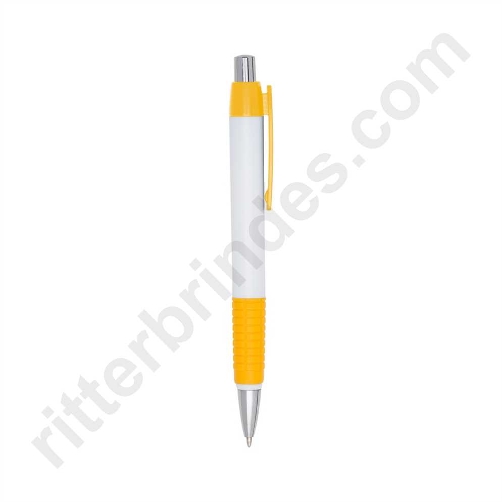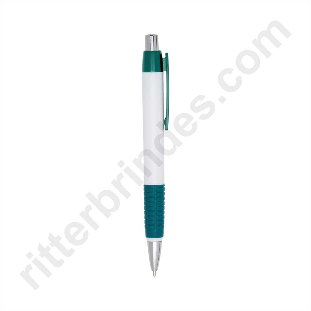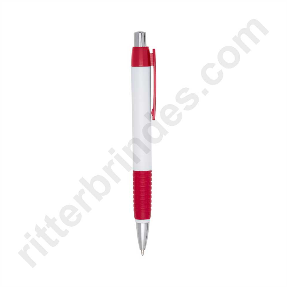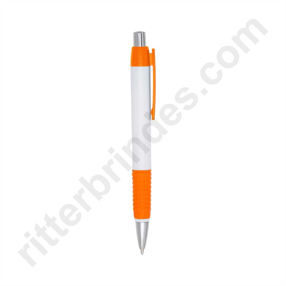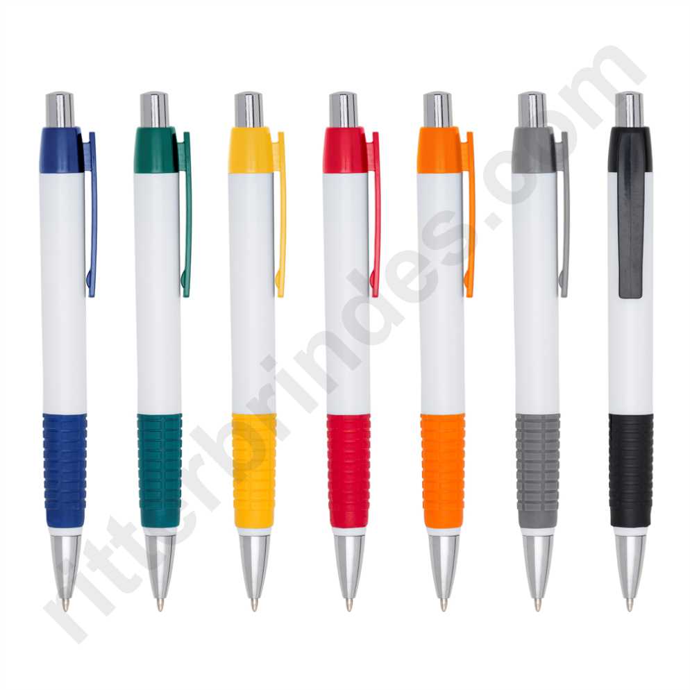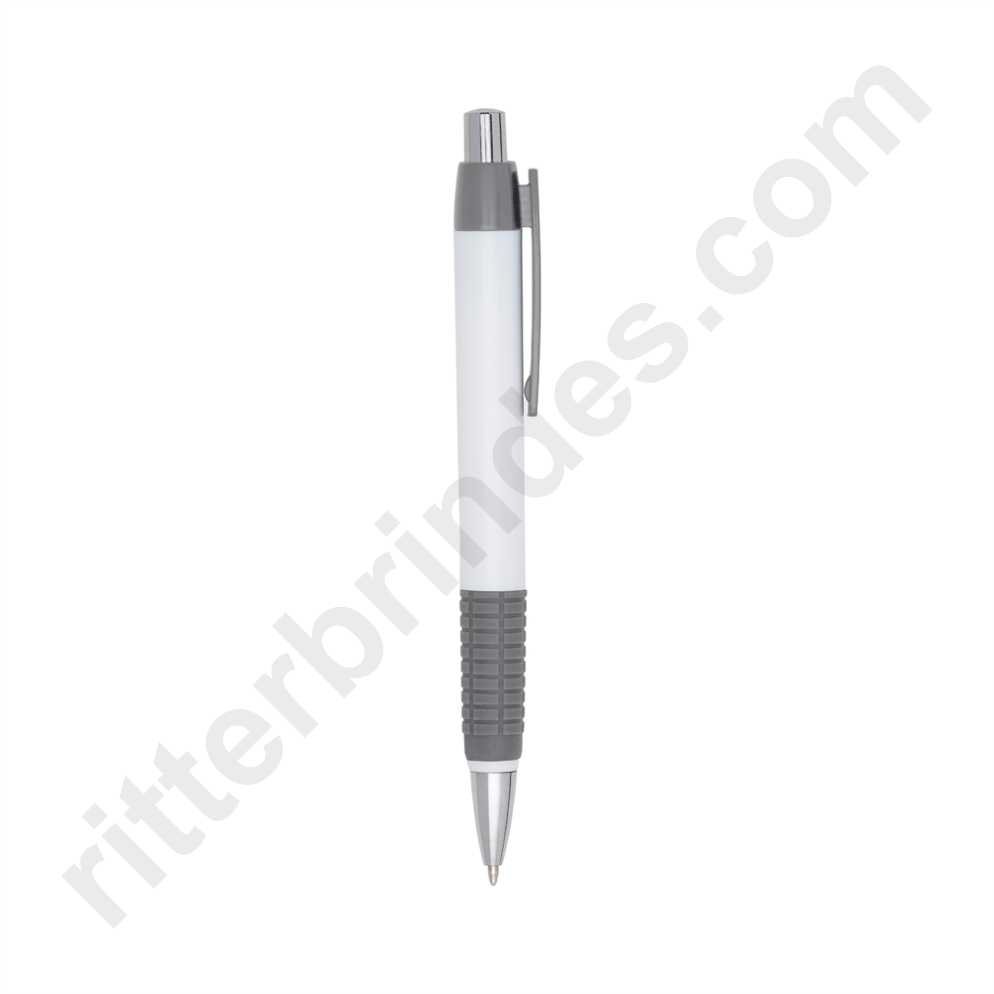 Caneta plástica corpo branco com detalhes coloridos. Clip plástico e detalhe inferior emborrachado com relevo, acionador e ponteira prateada(plástico). Aciona por clique.