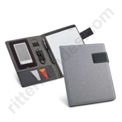 Pasta A5. Linho sintético e c. sintético. Fecho magnético. Bloco: 20 folhas pautadas. Chapa metálica com acabamento emborrachado. Acessórios não inclusos. 183 x 252 x 18 mm | Chapa: 50 x 30 mm