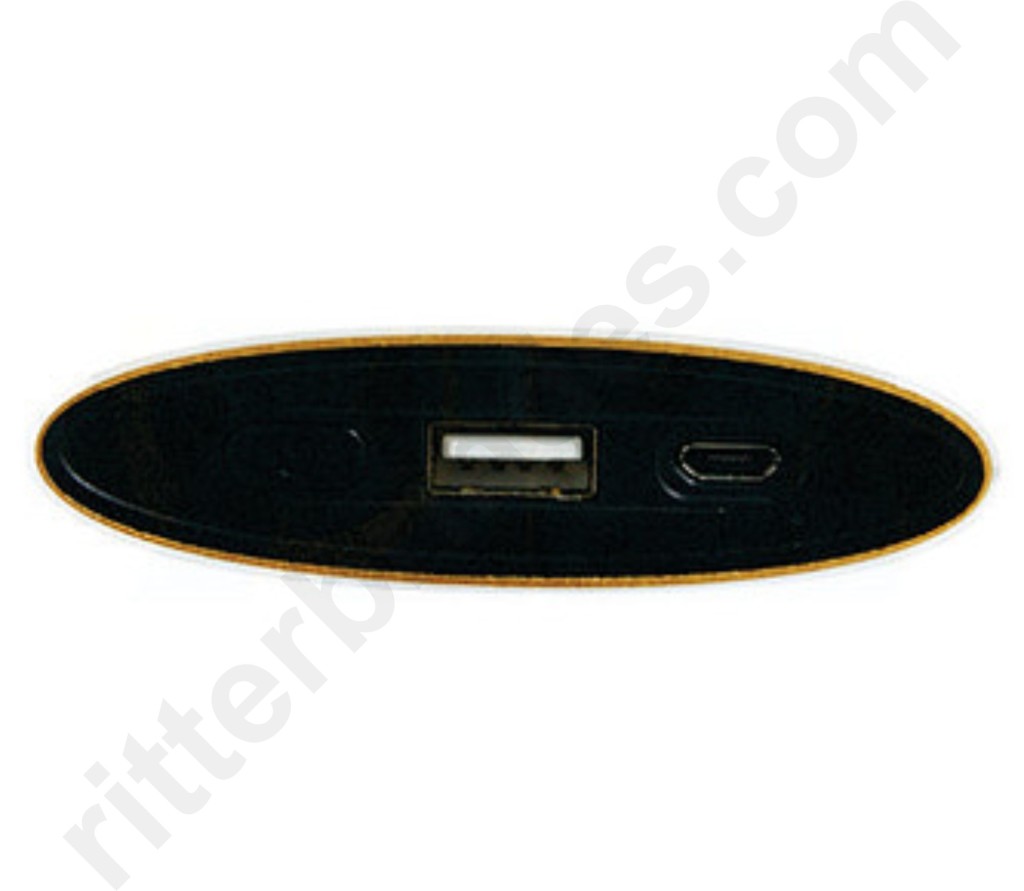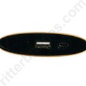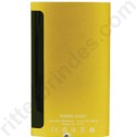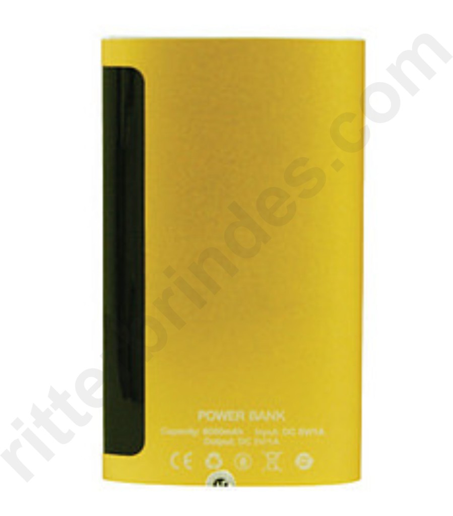 Power Bank Metálico com visor na cor DOU/PRE, com uma entrada USB e uma micro USB, botão para ligar e luz indicando a bateria.